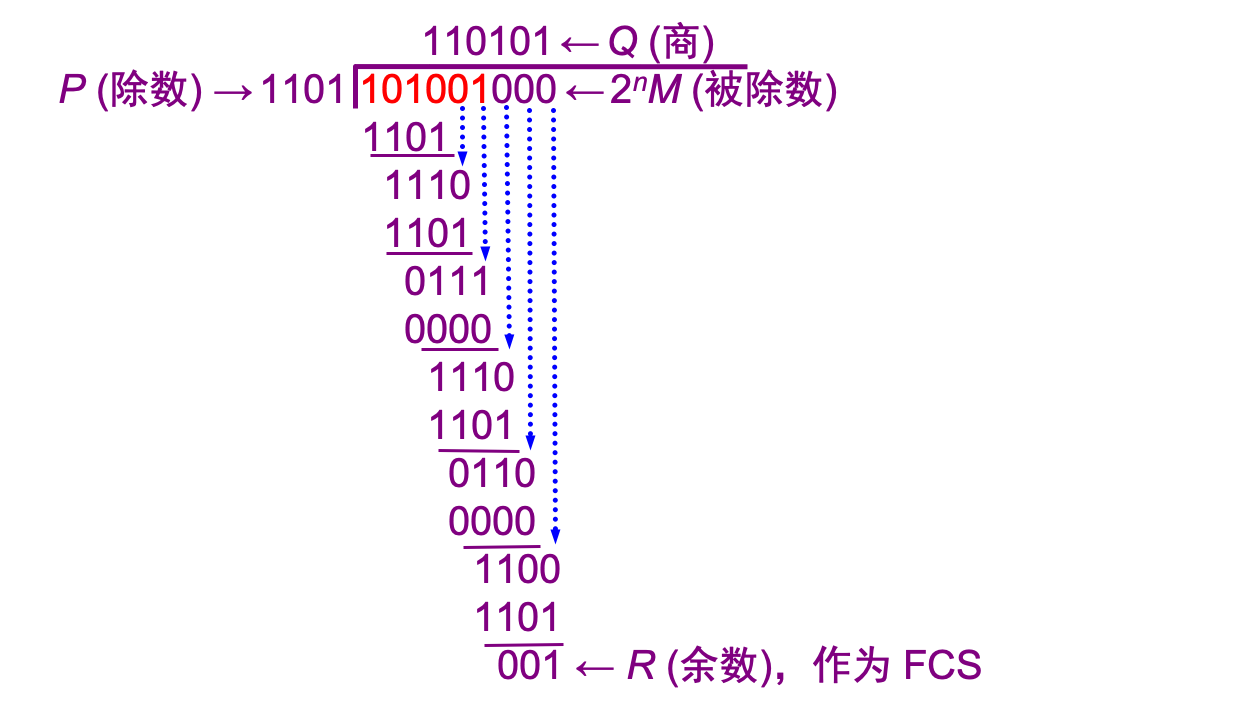 差错控制:在数据链路层传送的帧中,广泛使用了循环冗余检验 (CRC) 的检错技术:CRC是一种无比特差错,而不是无传输差错的检测机制。将得到的FCS(帧检验序列 )添加在原序列后面,在接收端检验:若得出的余数 R = 0,则判定这个帧没有差错,就接受(accept);若余数 R != 0,则判定这个帧有差错,就丢弃,在高层进行重传指令。