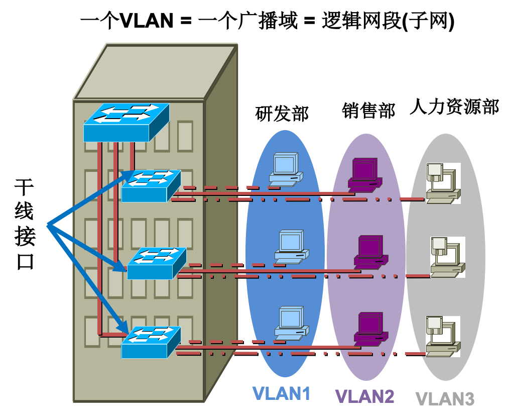 虚拟局域网可以建立与物理位置无关的逻辑组,只有在同一个虚拟局域网中的成员才会收到链路层广播信息。例如:在研发部某台主机广播的消息只能住研发部收到,销售部和人力资源部则收不到消息。