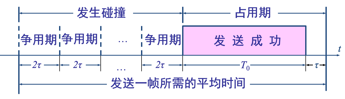 一个帧从开始发送,经可能发生的碰撞后,将再重传数次,到发送成功且信道转为空闲时为止,是发送一帧所需的平均时间。 信道利用率可以表示为:T0/发送一帧所需的平均时间。