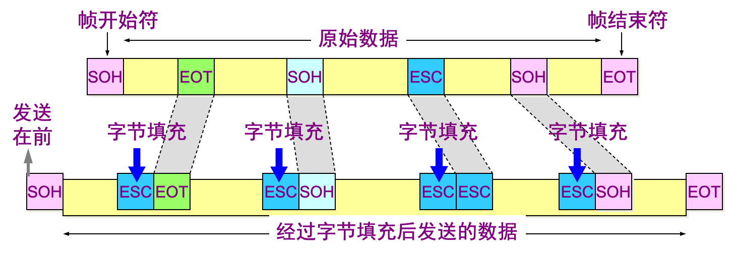 透明传输:发送端的数据链路层在数据中出现控制字符“SOH”或“EOT”的前面插入一个转义字符“ESC”。如果转义字符也出现数据当中,那么应在转义字符前插入一个转义字符。在接收端进行处理之后可以还原出原始数据。这个过程透明传输的内容是转义字符,用户察觉不到转义字符的存在。