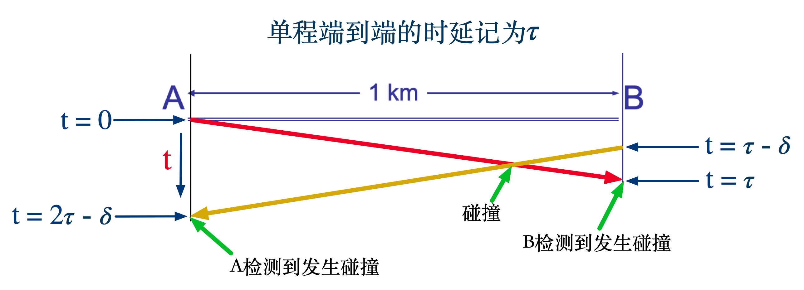 碰撞检测:在发送中,如果监听到信道已有其它主机正在发送数据,就表示发生了碰撞。虽然每个主机在发送数据之前都已经监听到信道为空闲,但是由于传播时延的存在,还是有可能会发生碰撞。